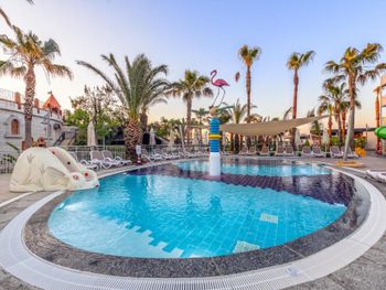 Отель идеален для отдыха с детьми, небольшая уютная территория, водные горки, бесплатные детские аттракционы, мини клуб, живой ПАВЛИН!!! с шикарным хвостом, отличные аниматоры не дадут скучать ни взрослым ни детям. Ресторан с меню на любой вкус. При общении с персоналом отеля проблем не возникало, практически все понимают русский язык.