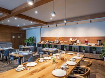 Вкусный завтрак. В ресторане вежливый и приветливый персонал. В самом ресторане удобно днем работать.