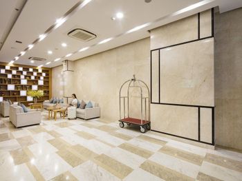 Красивый хол и удобные диваны для отдыха. Наличие весов для взвешивания багажа.