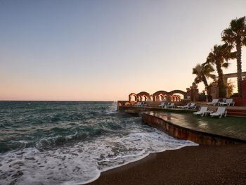 отель для пакетных туров, а это значит, что людей как в муравейнике. уборка посредственная, еда прям очень простая. алкоголь ужасный, барменов ждёшь по про часа. море с огромными волнами и вход только с лестницы, где тебя сразу накрывают большие волны. не комфортно. для детей есть мелкая заводь и песчаный пляж, но в этой части бьют ключи и вода ледяная. очень много туристов из РФ и есть ощущение, что ты в Анапе