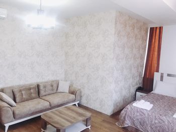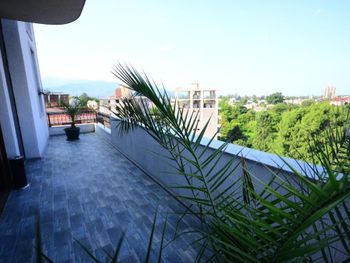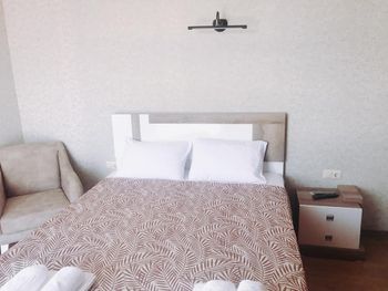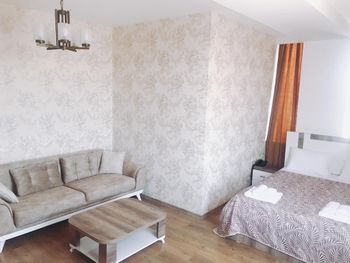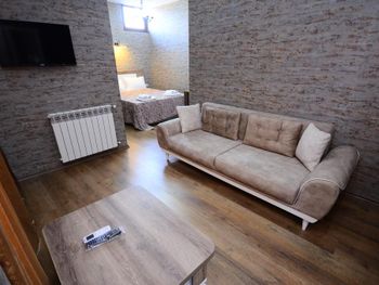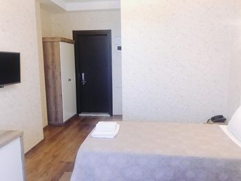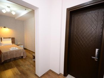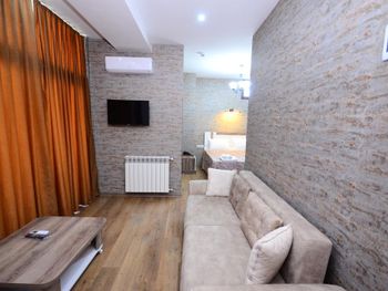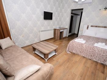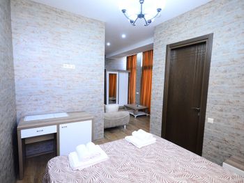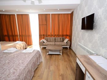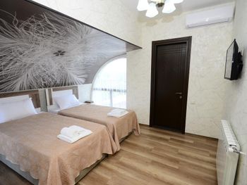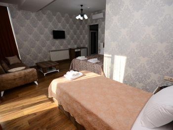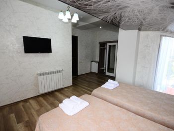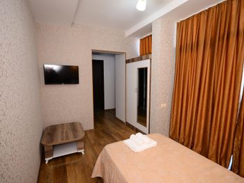 Отличный номер с большими и удобными кроватями. В номере есть балкон и кондиционер, чайник , холодильник и столик. Мы жили на 3м этаже. В отеле есть лифт. WI-FI работает отлично. Телевизоры настроены исключительно на грузинские и американские каналы. Мультики детям не посмотреть.