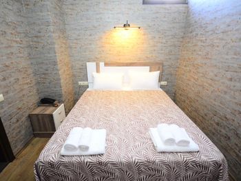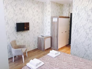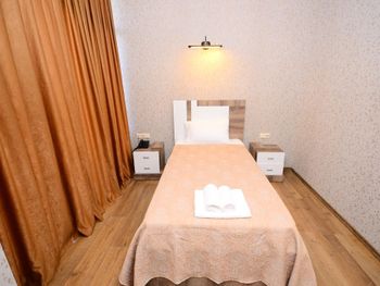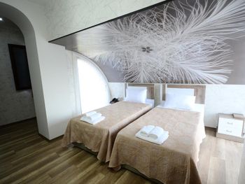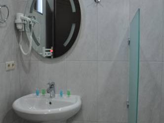 В номере не было стаканов или чашек, тарелок и даже ёршика для туалета. Не работал полотенцесушитель из-за чего вещи после моря не просыхали. Не хватило штор, чтобы закрыть окна. А полотенца были с пятном и с чужими волосами. Убирают номер, только если попросить. Душ совмещён сан. узлом и без перегородок, после принятия душа вся ванная комната мокрая, приходилось испробовать полотенца чтобы протирать пол.