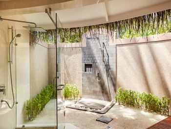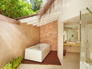 В вилле на пляже удобный подход к океану и вид на океан, в самих виллах прохладно и комфортно, есть летний душ, ванна и обычный душ.