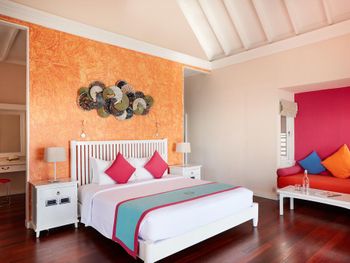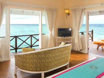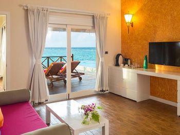 Жили в номере аква с бассейном на земле и в аква сьют  с бассейном на воде. Оба номера были с обновленным ремонтом. Остров не многолюдный,  кроме приемов пищи в ресторане остальных постояльцев видели редко. Персонал вежливый. Еда однообразная, но всегда находилось, что поесть взрослым и детям.