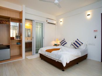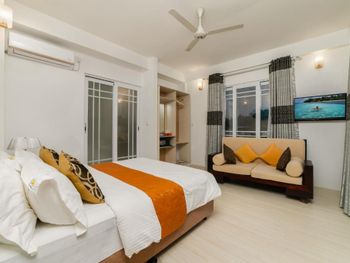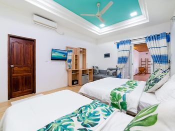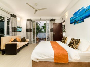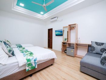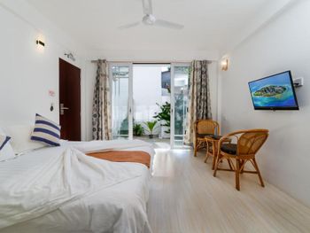 Из аэропорта нас довезли на общественном скоростном катере до острова. Время в пути больше часа. Цена в одну сторону 35$ и с ребёнка 11 лет тоже. Завтраки чередуются, то Мальдивский завтрак(кокос с тунцом-вкусно,местные лепешки,жаренное яйцо,хлеб,джем,масло, немного фруктов,сок),то европейский(сосиски, яйцо, тост,джем,масло,немного фруктов,сок).Кофе,чай,горячая питьевая вода бесплатно. Есть мини холодильник, кондиционер(работал хорошо), вентилятор.На 2 этаже есть балкон с видом на футбольное поле(играющих не слышно).До моря 2 минуты ходьбы.