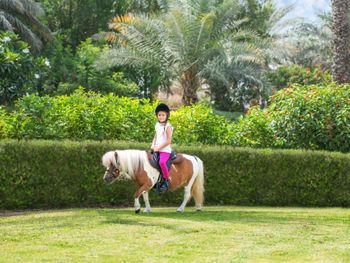Отличный курортный отель в его чистом виде. Нужно понимать, что это не тот стандартный отдых в Дубае на пальме или Марине. Это совершенно другой формат курортного отеля, который не подразумевает частые вылазки и подразумевает ваше постоянное прибывание на территории отеля, а точнее на территории всех 3х отелей, ибо вам доступна будет вся инфраструктура, да и нет границ между ними как таковых. Кстати, о ней - непривычно зеленая территория, усыпанная фонтанами, мостиками и прямо на территории свободны гуляют павлины. Есть свой маленький зоопарк, есть конюшня с большим кол вом лошадей, мини гольф, гольф поля, куча разнообразных баров и ресторанов.