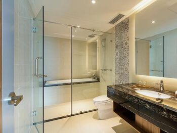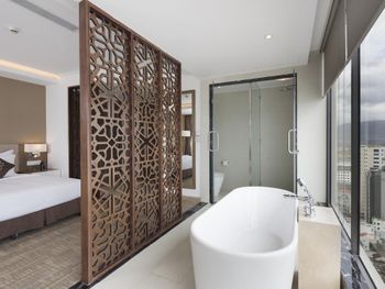 Жили в двухкомнатном номере с кухней на 26 этаже. Номер большой. Огромная ванная комната. Чисто. Уборка и смена полотенец каждый день. Вкусный запах у косметики.