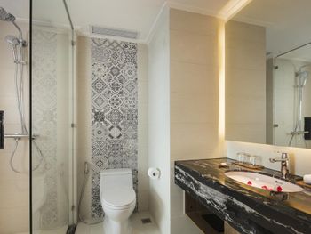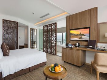 Бронировали «люкс с кроватью king-size и балконом». Номер просторный, поразил шикарный вид из ванной комнаты. В ванной комнате все необходимые принадлежности: одноразовые бритвы с гелем, зубные щётки с пастой, гребешок, ватные палочки, шапочка для душа. Комнате не хватает косметического ремонта: есть явные дефекты на стенах (двигали мебель), ржавое ведро для туалетной бумаги и тд. В целом, не сильно проблемно, но освежить ремонт можно. Нет дополнительной карточки для кондиционера. Возвращались с улицы в духоту