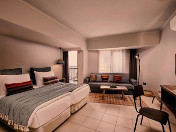 Сам номер Люкс был странный - состоял из 2х маленьких комнат( в одной комнате диван и мини-кухня, в другой 2 кровати и шкаф). Мини-кухня только занимала место, т.к.плиты нет, чайника нет, все шкафы пустые даже элементарно нет ни одной тарелки, чтобы фрукты положить. Хорошо хоть 2 стакана было на троих! Владельцы отеля могли бы оснастить кухню посудой и приборами, иначе кухня бесполезная.