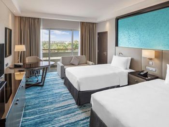 Шум. Отель около года назад выкуплен у сети Hilton, некоторые корпуса закрыты на ремонт со всеми вытекающими: шум пил, дрелей, молотков и т.п. Очень шумный кондиционер. Закрыв окно утром, чтобы оградить спящего ребёнка от шума стройки/ремонта, обнаружилось, что кондиционер завывает как пылесос с периодическими посвистываниями. Уборка соседних номеров, на удивление, проходит с постоянными ударами входной двери. Слышимость в номере отличная, поэтому каждый удар двери неожиданно прилетает вам по ушам. И так 10, 20, 30 раз. После замечания уборщик стал дверь придерживать. Утром повторилось то же самое уже с другим уборщиком. Душ был забит, вода практически не смывалась. Мелочь, но тем не менее минус. Завтрак абсолютно посредственный.