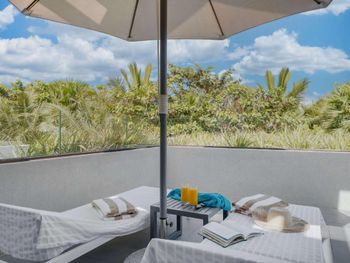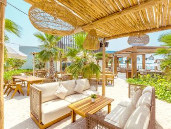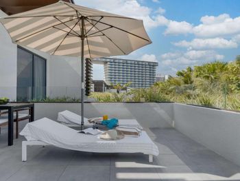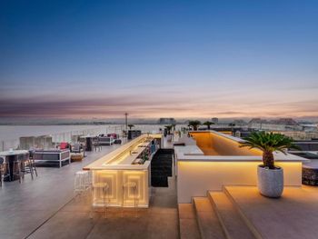 новый отель, современный дизайн, хорошая постель, вид с балкона, кафе на крыше, бар на пляже