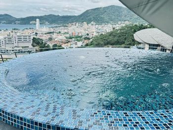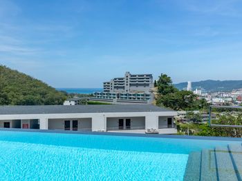 Бассейн холодноват. Вид на море и горы частично блокируется холмом на котором стоит один из корпусов.