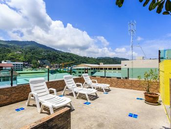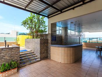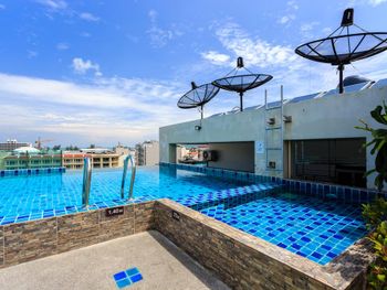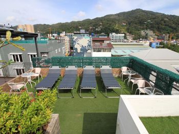 Недалеко от Бангла, но шума от нее не слышно, неплохой бассейн на крыше, есть лежаки.