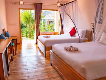Персонал отеля помогал во всем. 1)Украли шлепки у бассейна (кто-то из постояльцев), я обратилась на ресепшн. Они просмотрели камеры видеонаблюдения и через несколько часов, вернули обувь. 2)Арендовали байк от отеля, уехали на пляж. По моей глупости заблокировали байк. Местные позвонили в отель , через 10 минут работник ресепшена приехал и "спас" нас - бесплатно. Остальное по мелочи, но ни одна просьба не оставалась не услышанной. Сам отель понравился - территория ухоженная и зелёная, всё цветёт 🌸. Бассейн чистый , лежаков хватает. В номере мебель немного уставшая. Кондиционер работал отлично 👌. Убирались и меняли полотенца ежедневно. Завтрак скромный, но голодными не уйдете.
