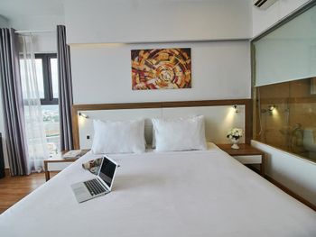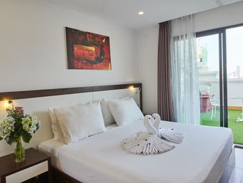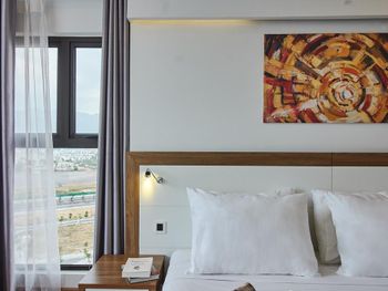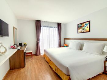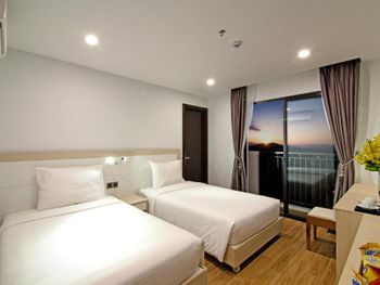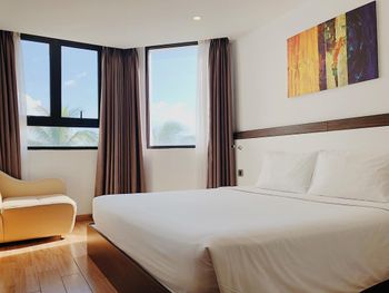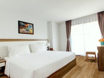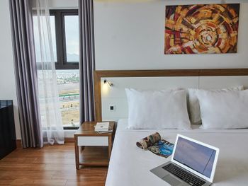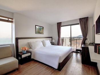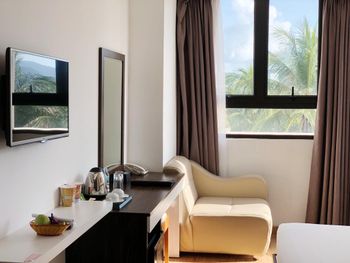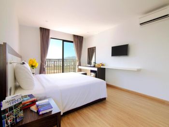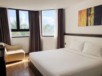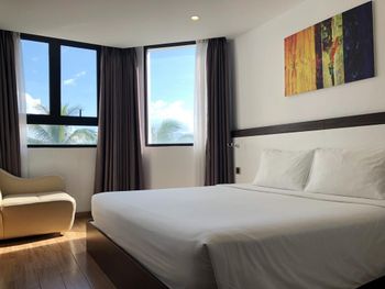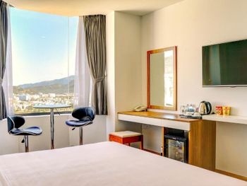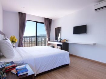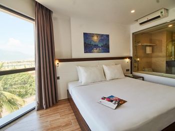 до моря близко, приятный вид из окна на аэропорт и горы, хороший размер номера и кровати ( жили в делюксе) ; есть маленький балкон, сушить вещи удобно, полотенца и постель чистые . Организовали такси (350 донгов) и завтрак с собой при отъезде.