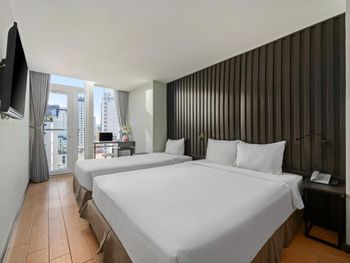 Завтрак в отеле подавался средненький но, по такой цене, что я смог забронировать номер, думаю, что все нормально. Единственное (с учетом того, что я и моя семья не едим свинину) все время приходилось спрашивать есть ли в том или ином блюде свинина. А так нормально. Фруктами заедались. По фотографиям номера кажутся шире чем на самом деле. А на площадь номера, каюсь, при бронировании сам не обратил внимание. И еще при бронировании я отметил, что нас будет четверо, а по приезду в номере оказались две кровати, одна двуспальная и одна односпальная. Пришлось доплатить за третью кровать, почти половину того, что я заплатил за весь номер. Но в целом впечатления неплохие и мне и моей семье понравилось.