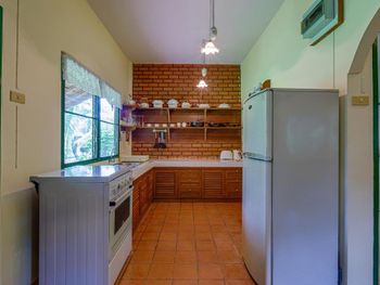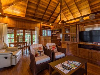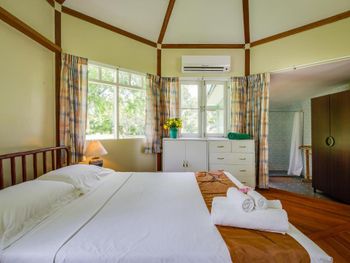 В вилле везде муравьи, стены из вогонки, местами в щели видно улицу, стоит выключить кондиционер почти мгновенно становится жарко, домик совсем не держит прохладу. Вместо двери в ванную-туалет шторка. Дороги на территории из щебенки с цементом, из за этого постоянно грязная обувь. В предпоследний день даже не стали убираться, не вынесли мусор, после обращения на ресепшн вынесли мусор который стоял на улице, в домик даже не заглядывали. Под нашим домом поселилась белка и ночью скреблась под полом.