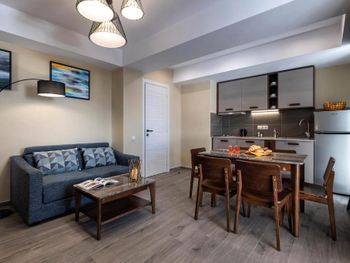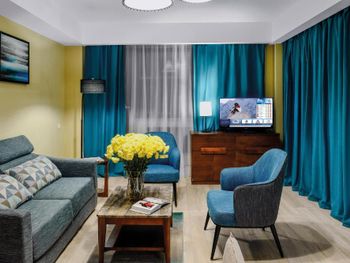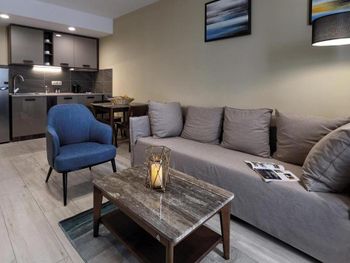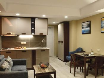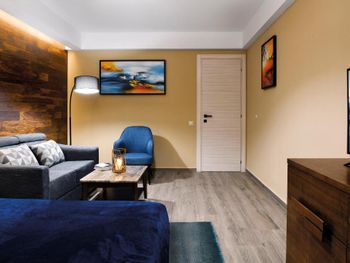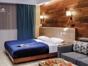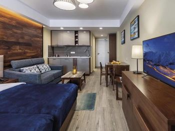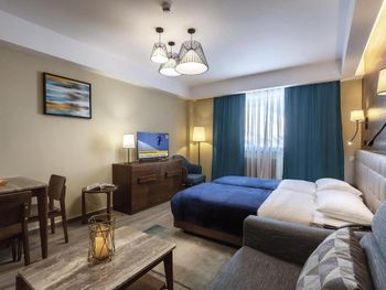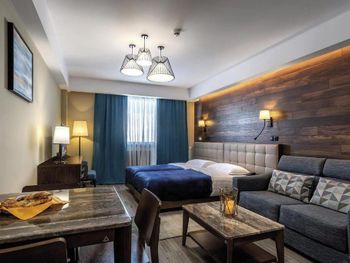 Прекрасные чистые апартаменты. Расположены примерно в 50 м от горнолыжного склона. В номере имеется плита, чайник, сковородка, холодильник. Бронировали номер 35 м2, оказалось, что в номере есть дополнительная маленькая комната (около 6м2) с 2-х этажной кроватью, хотя это не было указано на сайте. Для семей с детьми, это прекрасное решение. На 1 этаже находится ресторан грузинской кухни, готовят вкусно и качественно, но не уделили должное внимание интерьеру, выглядит как обычная столовая. В соседнем здании (расстояние 20 м) расположен небольшой спа-комплекс, который входит в стоимость проживания. Большие и удобные шкафчики для хранения лыж и инвентаря на 1 этаже.
