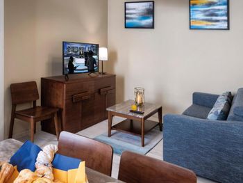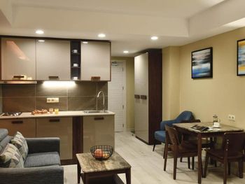 В некоторых номерах также имеется кухня с холодильником, микроволновой печью и плитой.