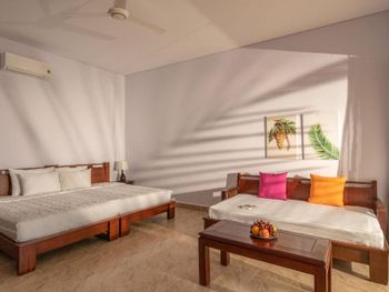 Понравилось все: Завтраки, чистые и большие комнаты, чистый пляж, ужин, зеленая территория, персонал, вид с балкона и расположение домов на пляже - это сказка. Никто за две недели особо не портил нервы и убирались регулярно. На самом деле отель заслуживает внимания туристов, отель достаточно высокого уровня. За две недели не было ни разу мысли уехать из него или поменять на другой отель - это говорит о многом. Отдельное спасибо за завтраки обеды, в итоге решили кушать чаще в отеле и не искать приключений на свой желудок. Пляж песочный расположен вдоль домов его хватает для всех гостей, постоянно убирают основной пляж (отдаленные уголки могут скапливать мусор, но это мы заметили к концу путешествия ) , стараются следить даже за состоянием воды, поэтому вцелом ни грязи, ни запахов нет никаких. Спокойствие, зелень, удобные лежаки и гамаки. Но!!! Не хватает курсов йоги.