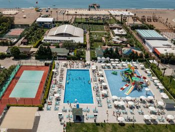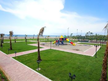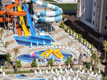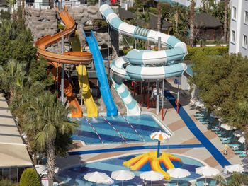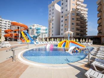 3) Территория отеля небольшая, но ухоженная и красивая. На территории отеля есть несколько бассейнов с разной глубиной, есть большие горки для детей постарше и взрослых. У одного из бассейнов есть купол, что очень спасает от активного солнца. У отеля есть свой большой, ухоженный, красивый пляж с бассейном и горками для маленьких детей.