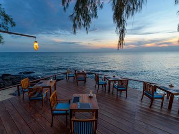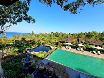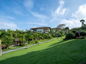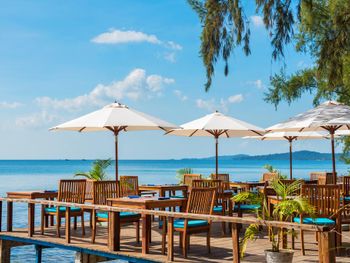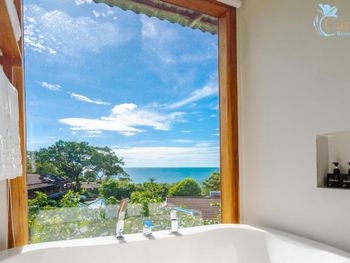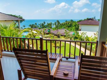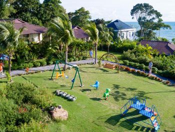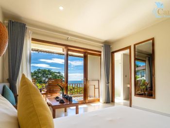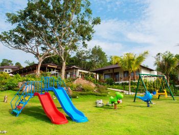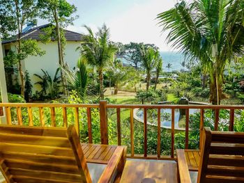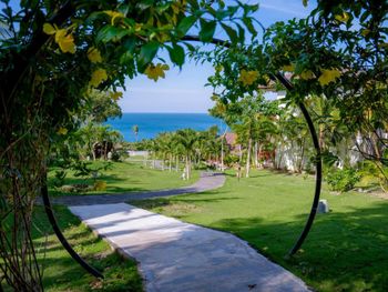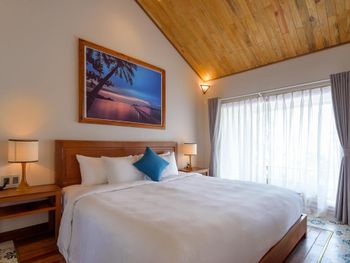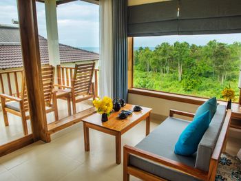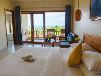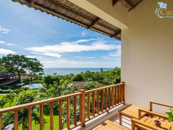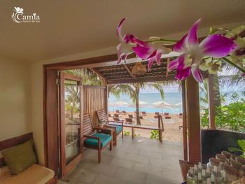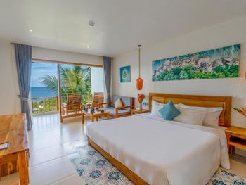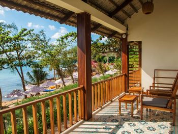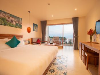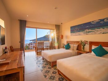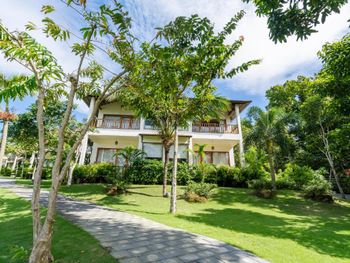 Отдыхали с ребенком 2 года, забронировали ocean view, эта категория номеров предоставляется в самом дальнем корпусе от пляжа, в этом же здании на первом этаже парковка и перед парковкой контейнеры с мусором. Мы попросили нас переселить в номер с видом на сад, но ближе к морю - дышать мусором и идти 500 метров по ступенькам с ребенком не вариант. Пляжа нет вообще, не грамма песка, только камни. Можно отдыхать у бассейна, рядом с которым лежит насыпной песок. Войти в море можно с пирса через лестницу, с которой страшно спускаться, наконец когда вы спуститесь, ваши ноги запутаются в высоченной траве, через которую нужно пробираться вплавь - это полный дискомфорт и неприятное купание. Отель находится в отдалении от всего, с ребенком вы не находитесь в ближайшее рестораны, спуск в горы, собаки бездомные, курицы, коровы, все это сразу за пределами отеля. Можно кушать в отеле, что мы и делали, ресторан находится у воды, комаров огромное количество, это тоже дискомфорт. В отеле нет времени для тихого часа, ежедневно, то ремонт здания, то косят траву, уложить ребенка не возможно в таком шуме. Мы отдыхали в 5 отелях на фукуоке - за такие деньги без моря в отеле делать нечего.