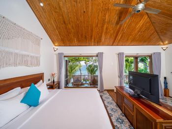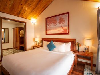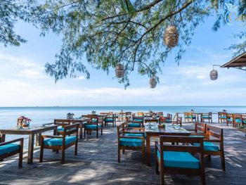 Из минусов. Пляжа ни какого нет вообще,вход в море,а тоько ради моря мы и приехали на Фокуок,каменистый, не оборудованный, входить не приятно и в море особо никто и не купается. На берегу стоят лежаки,есть не большой бассейн. С лева и с права ,на берегу мусор . И хоть формально ,это уже не территолрия отеля,но битые унитазы с берега можнобыло бы и убрать.Моя семья только раз и сходила до моря,больше отказались. Сплошное разочарование. Еще не понралилось,что не смотря на то,что в отеле 50% русских,ник то из персонала не говорит на нашем языке и нет ни какой информации. Вот приехал-вот тебе ключи и сиди у себя в номере. Развлекательной программы тоже совсем ни какой. Но самый огромный минус отель находится на высоченной горке,работает только на завтраках и вам все равно придется идти минут двадцать до ближайшего поселка на ужин или в магазин,по неосвещенной дороге,без тротуаров-вьетнамская специфика,уворачиваясь от машин и мотциклов,в духоте. Мы ходили с фонариками и все равно чуть не наступили на змею,она переползала дорогу. Могли бы пустить трансфер в деревню и на песчаный плж соседнего отеля Манго-бей,раз в полчаса,так многие отели без пляжа делают в Тайланде и решили бы проблему.